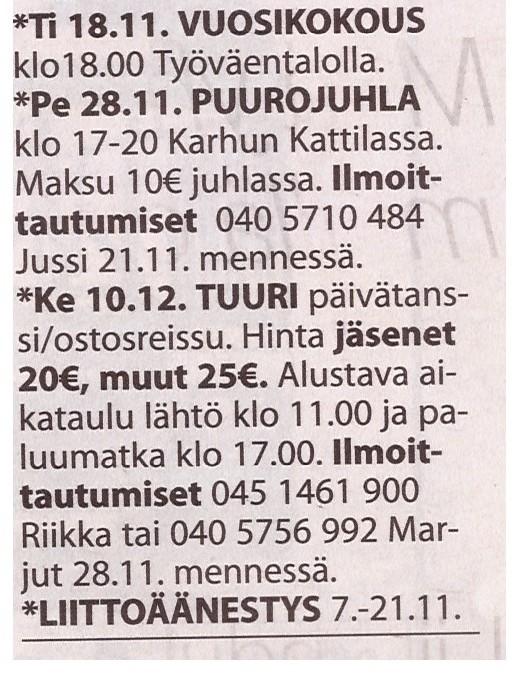 Myynnissä adresseja, hinta 10€. Kysy sihteeriltä 0405756992.