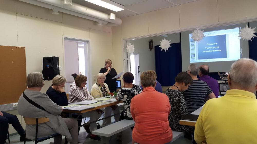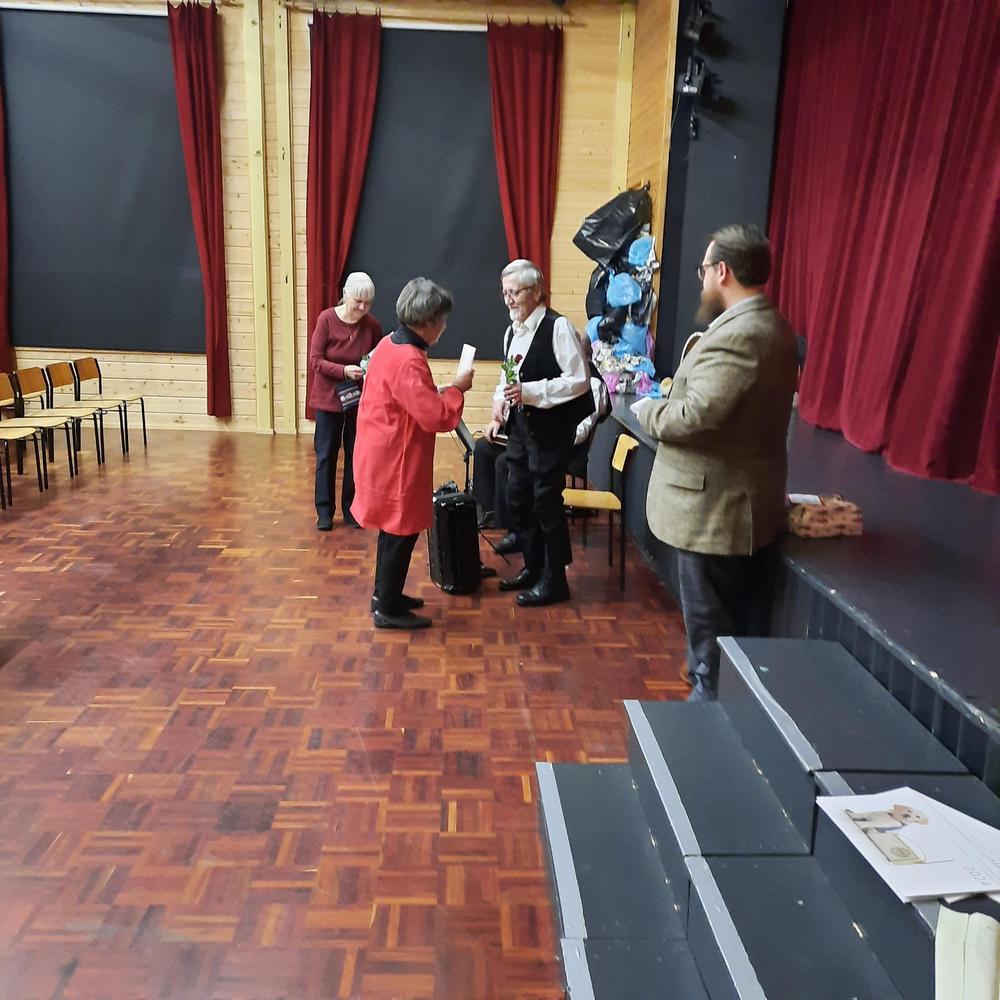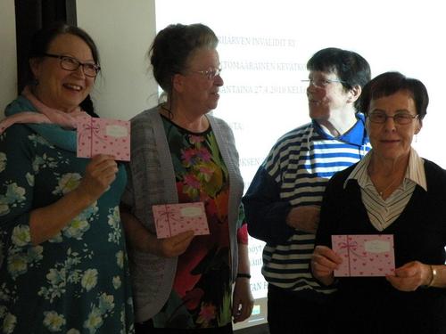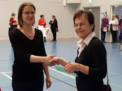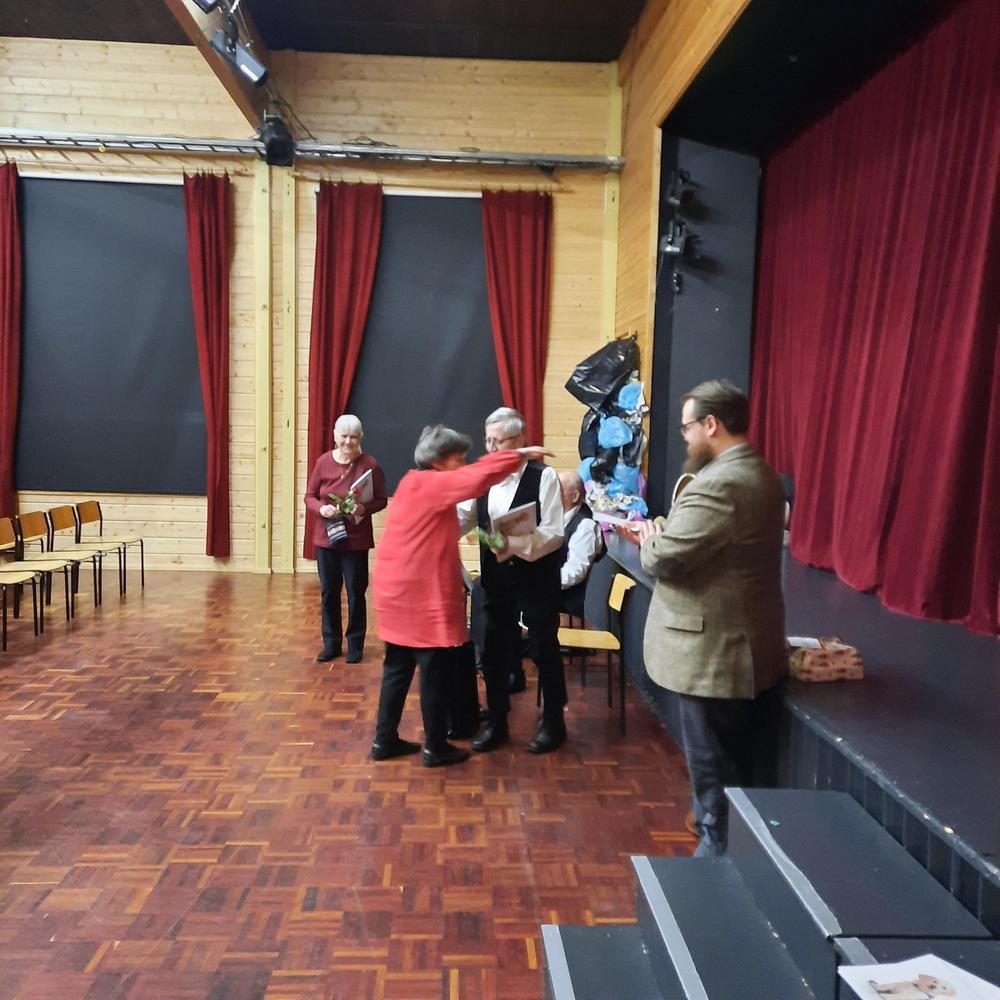 Yhdistyksen kevätkokouksessa pj. Tapio Kinnunen ja vara pj. Aili Ruotsalainen onnittelevat aikuisen naisen ikään ehtineitä Martatta Tolppilaa sekä Linnea Rämästä