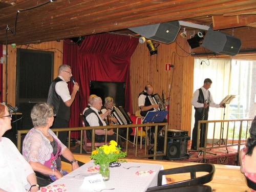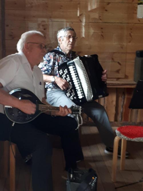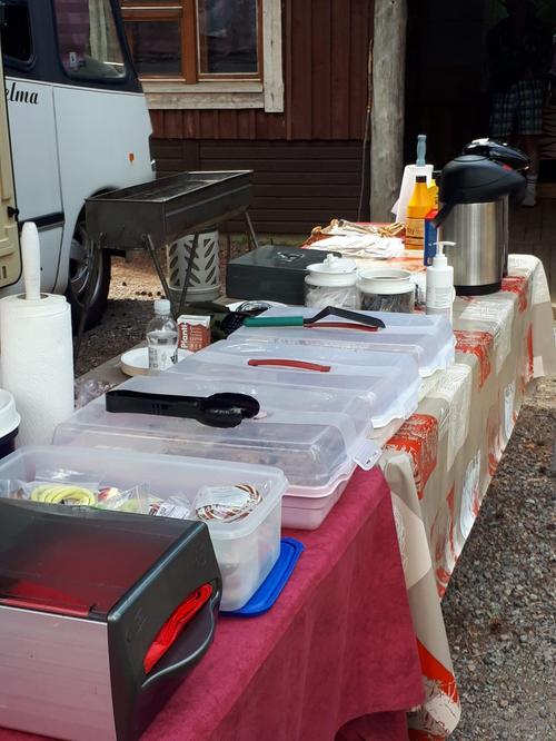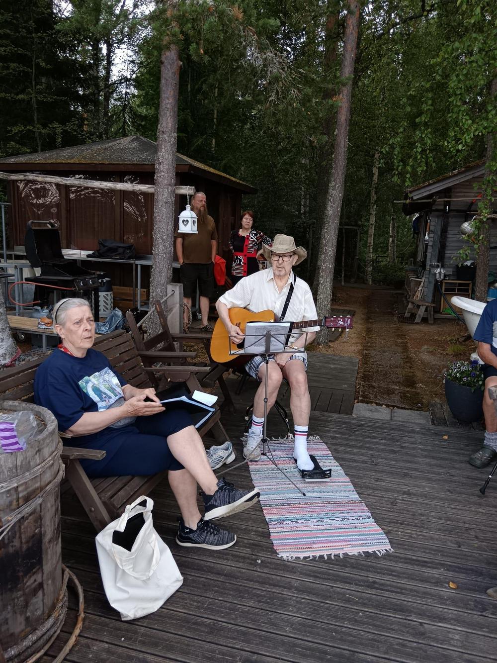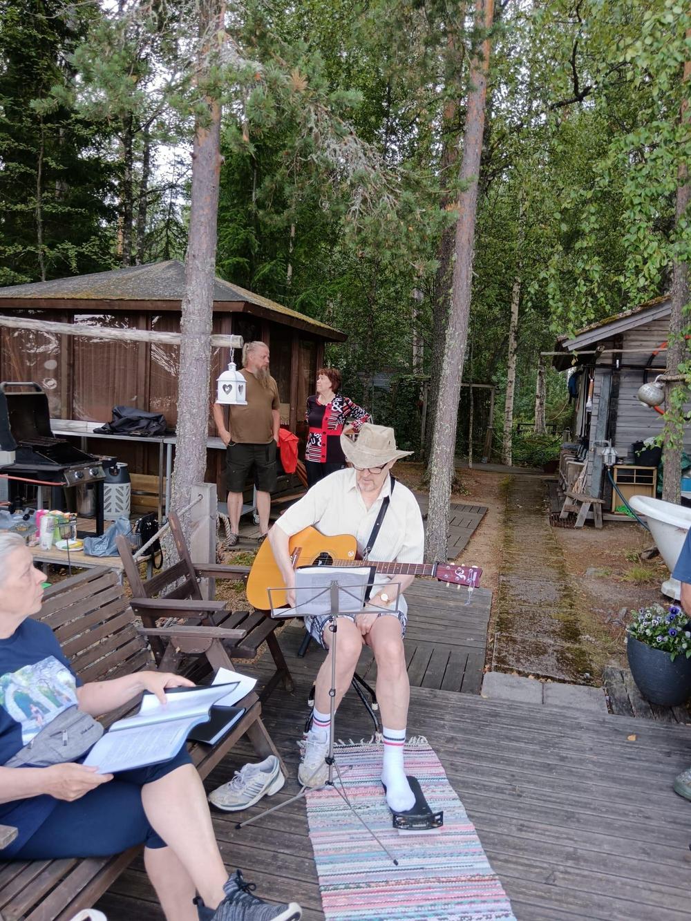 Kahvittelua, grillausta, laulua Kauppisen kesämökillä 5.8.2025. Pieni sadekuurokaan ei haitannut iloista seuruetta